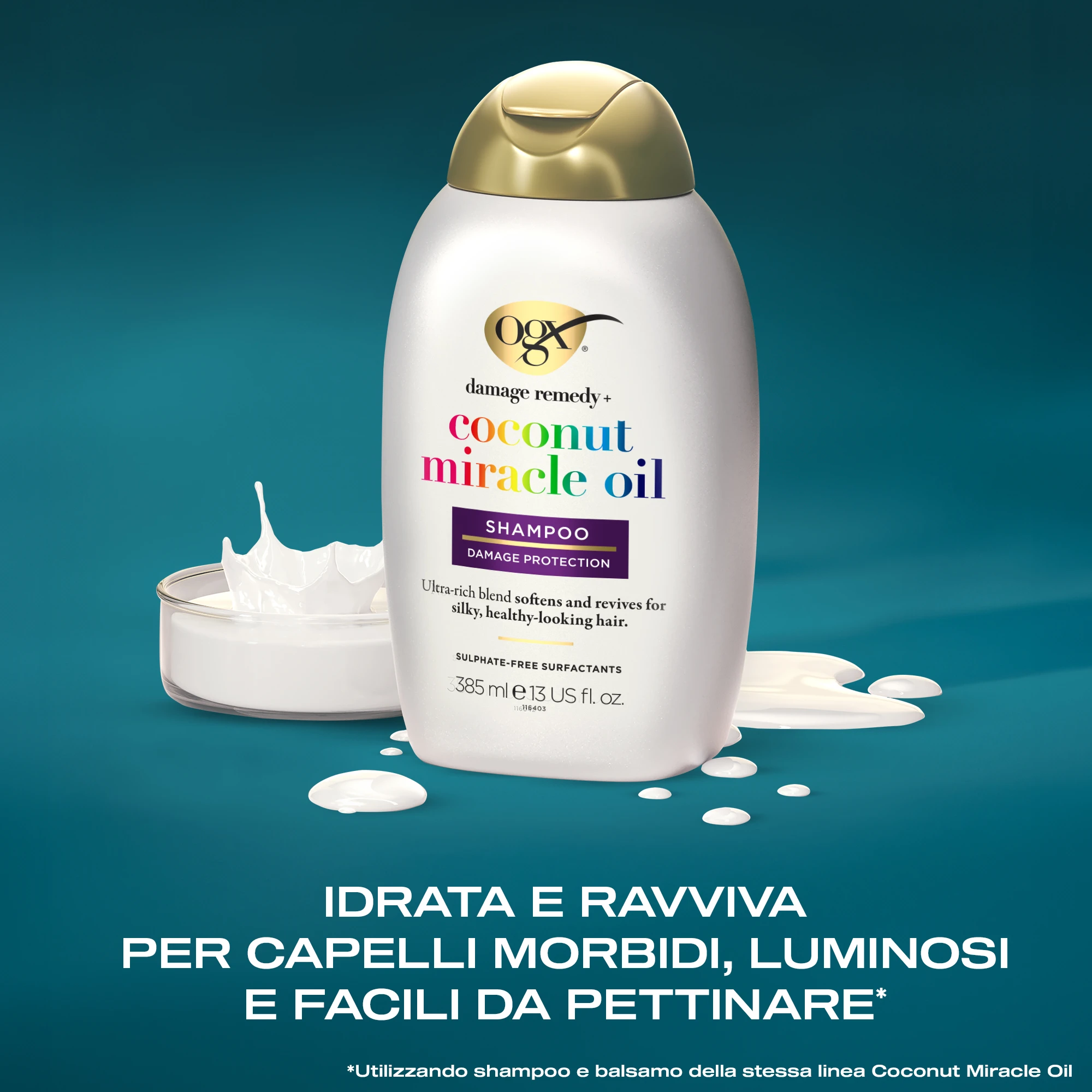 Ripara e ravviva i tuoi sensi e i tuoi capelli con lo shampoo OGX® Extra Strength Damage Repair + Coconut Miracle Oil. Questo shampoo per capelli danneggiati aiuta a trasformare i capelli spessi e ruvidi in una perfezione setosa. Ideale per capelli secchi o crespi, questo shampoo idratante aiuta anche a calmare l'effetto crespo e a domare le ciocche ammorbidendole e riparandole. Questa miscela nutriente e riparatrice per capelli danneggiati è arricchita con olio di cocco e la sua formula aiuta a donare lucentezza, brillantezza e morbidezza ai capelli, insieme all'estratto di baccelli di vaniglia e all'essenza di tiaré, un olio profumato ottenuto dall'immersione dei petali in olio di cocco. In più, il profumo di latte di cocco, mandarino e calda vaniglia trasforma il lavaggio dei capelli in un'esperienza sensoriale a tutto tondo, che lascia sui capelli un profumo irresistibilmente buono. Senza tensioattivi solfati, questo shampoo rigenerante al cocco rappresenta la bellezza pura e semplice. Per una routine completa di cura e riparazione dei capelli crespi, abbina questo shampoo anti-crespo al balsamo OGX® Coconut Miracle Oil.
